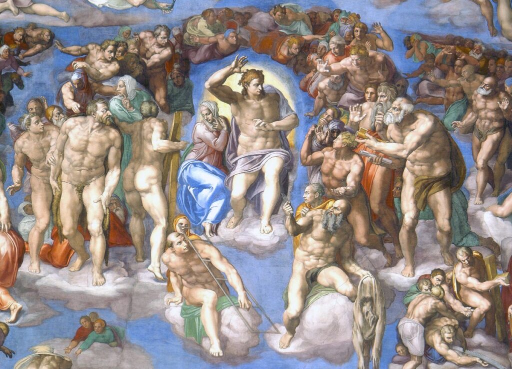 In the huge Last Judgement (right, 1541), figures around the powerful figure of Christ are arranged as if in a seething whirlpool. The strong agitated composition, indeterminate space, tortured poses and exaggerated musculature make the work an example of the style known as Mannerism.